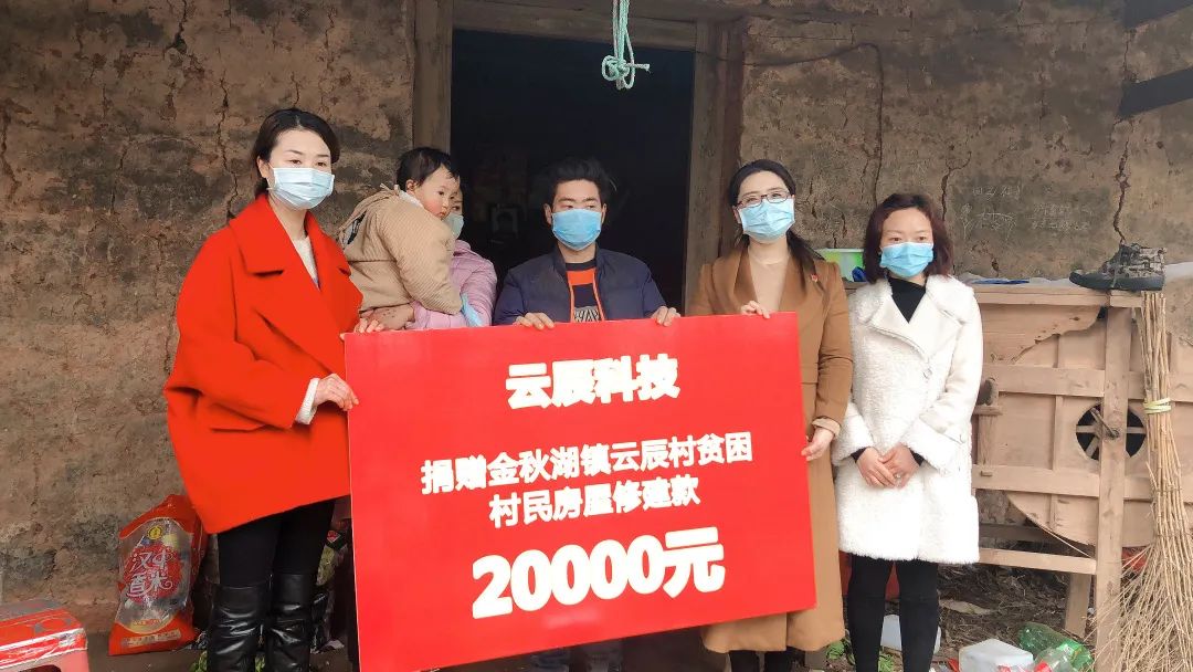 2月22日上午,云辰科技总经理张怡、副总经理杨静、吴萍来到金秋湖镇云辰村贫困户刘志家中,为这一家人送去房屋修缮款20000元。